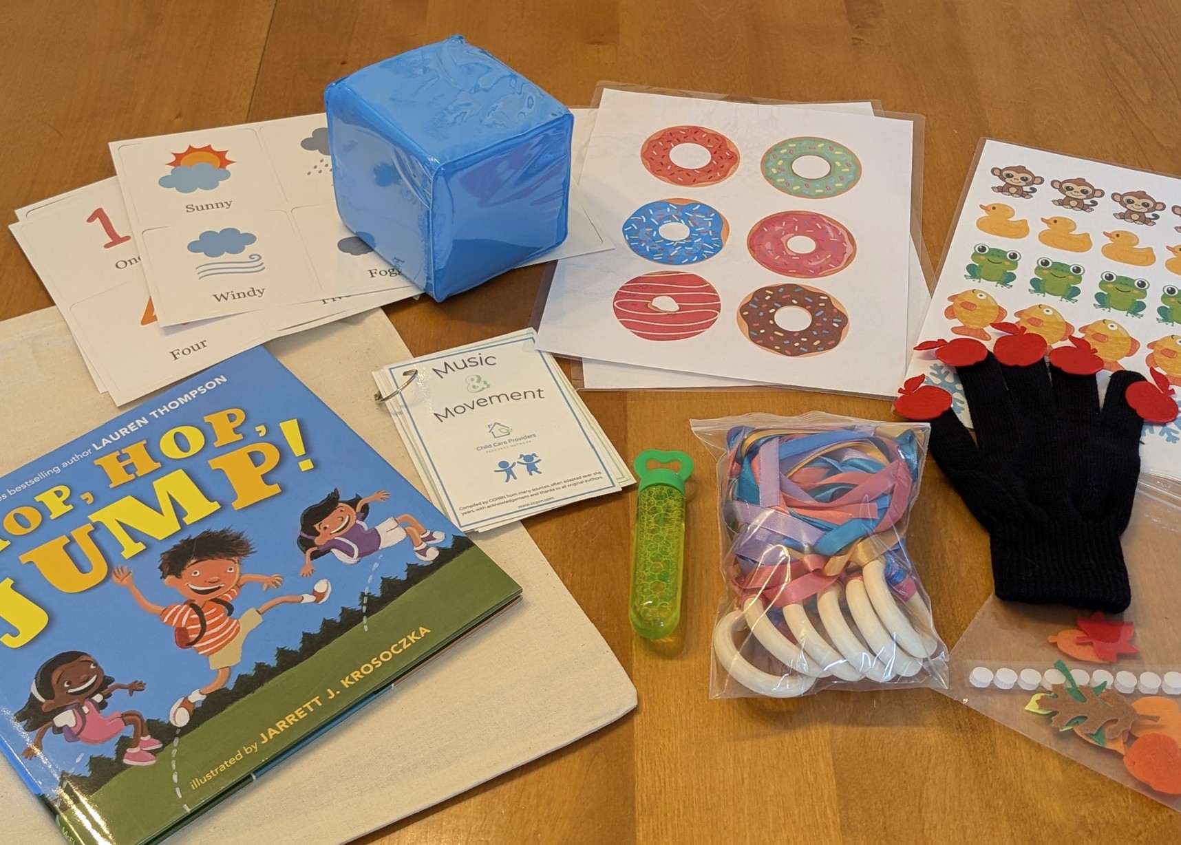 Everything you need for a fun and engaging active circle time – or to use anytime throughout your day! This kit includes a story/movement cube (and assorted cards – you can also use the back to create your own!), a set of 6 ribbon rings, a glove with felt and laminated shapes (for 5 little apples, 5 little ducks, etc.), a mini bottle of bubbles, a book, a ring with LOTS of songs, rhymes, etc., and the bag that you can customize for your program! *Items may vary slightly. A handout with ideas for how to use the items is also included.